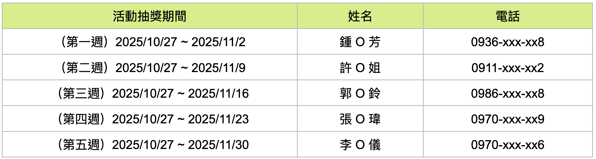 例如參加人於 2025/10/27-2025/11/2 依照上述要求購買任一車系 Smartscooter® 智慧電動機車乙台並付清全額,即享有參加 2025/10/27-2025/11/2 該週之抽獎機會,每筆訂單限享有一次抽獎機會,該抽獎機會不可遞延使用至下週抽獎活動,即參加人參加 2025/10/27-2025/11/2 之抽獎活動但未抽中獎項時,該名參加人之抽獎機會即使用完畢,恕無法參加下一週2025/11/3-2025/11/9 之抽獎活動。 - 得獎名單公布:Gogoro 將於活動期間結束後 2 個月內抽選完畢,並於 Gogoro 官方網站活動頁面公布得獎名單。