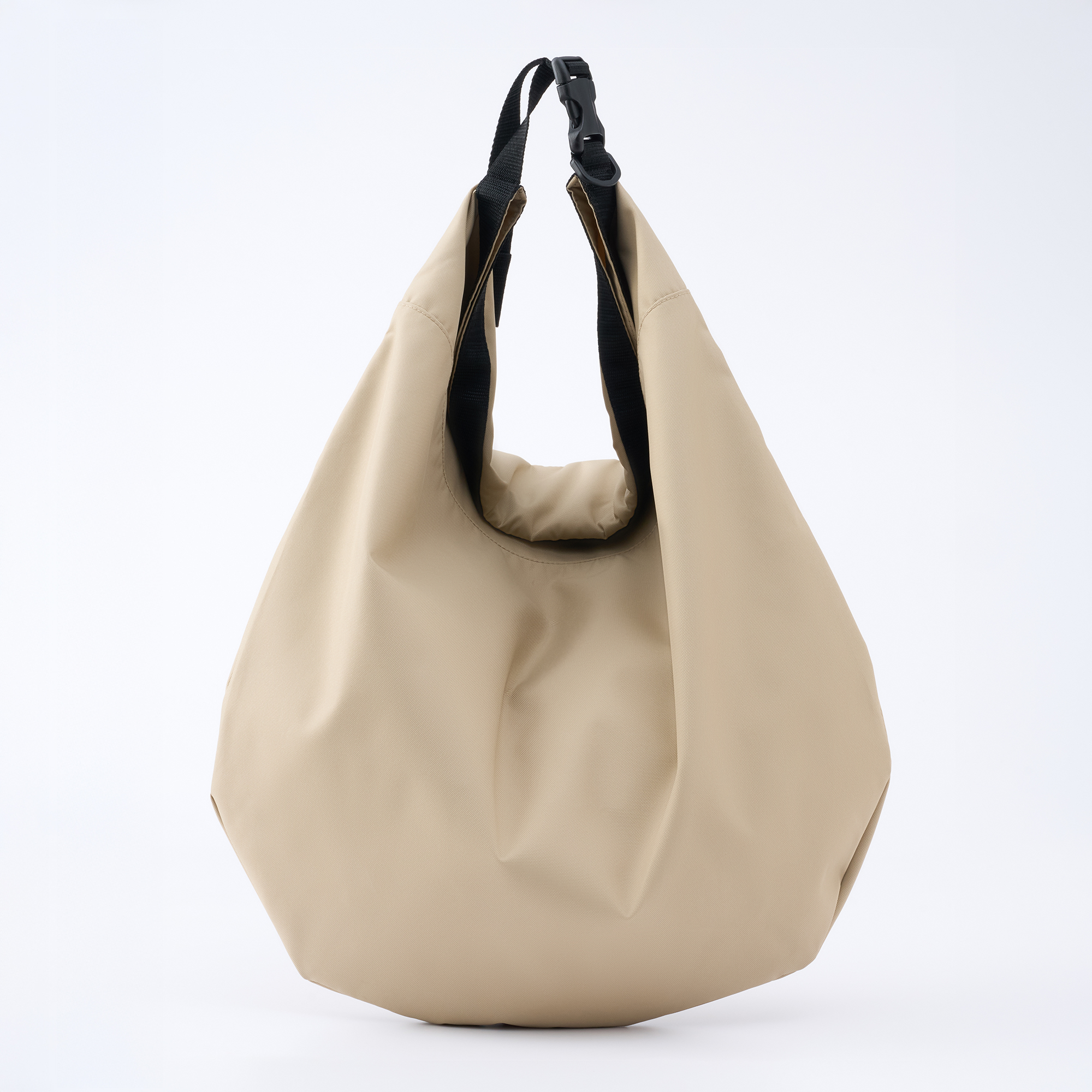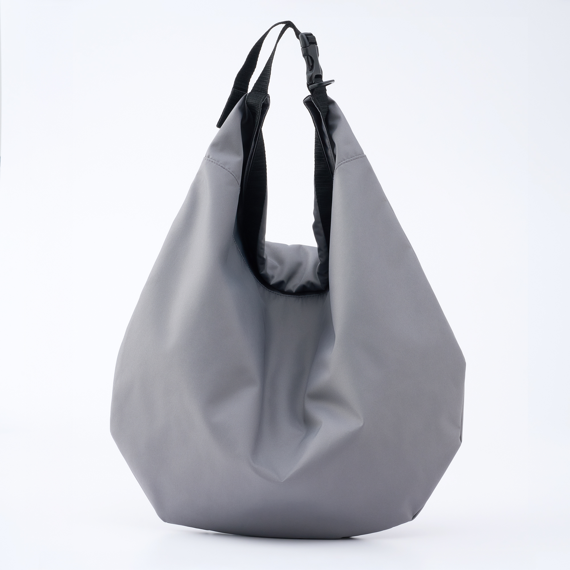 可手提也可肩背的購物袋,表面施以防潑水加工,織帶長度可調整。可依內容物大小將袋口向下捲收、調整包款容量。