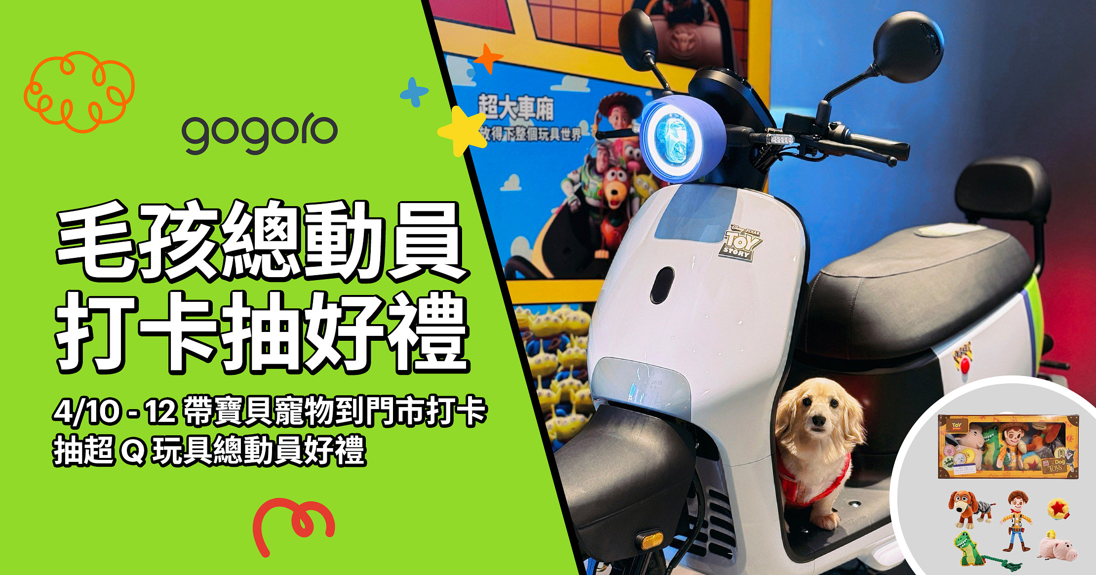 - 2026 年 4 月 10 日起至 2026 年 4 月 12 日止(下稱「活動期間」),凡於活動時間至 Gogoro 指定活動門市*,攜帶寵物與玩具總動員系列車款拍照並至 IG 限動打卡 @gogoro_taiwan (官方帳號)、並完成填寫簡易問卷,即可參與「玩具總動員寵物咬咬玩具」抽獎活動。每間 Gogoro 指定門市*抽出一位中獎者。