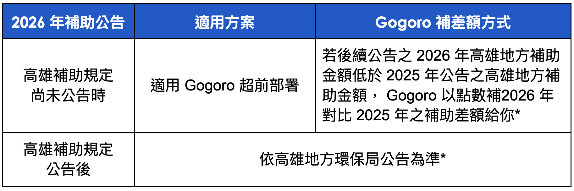 *於 2026 年高雄地方補助公告後,參加人需透過 Gogoro 送件申請 2026 年高雄地方補助並通過審核後,若後續公告之 2026 年高雄地方補助金額低於 2025 年公告之高雄地方補助金額, Gogoro 始以點數補 2026 年對比 2025 年之補助差額給參加人。