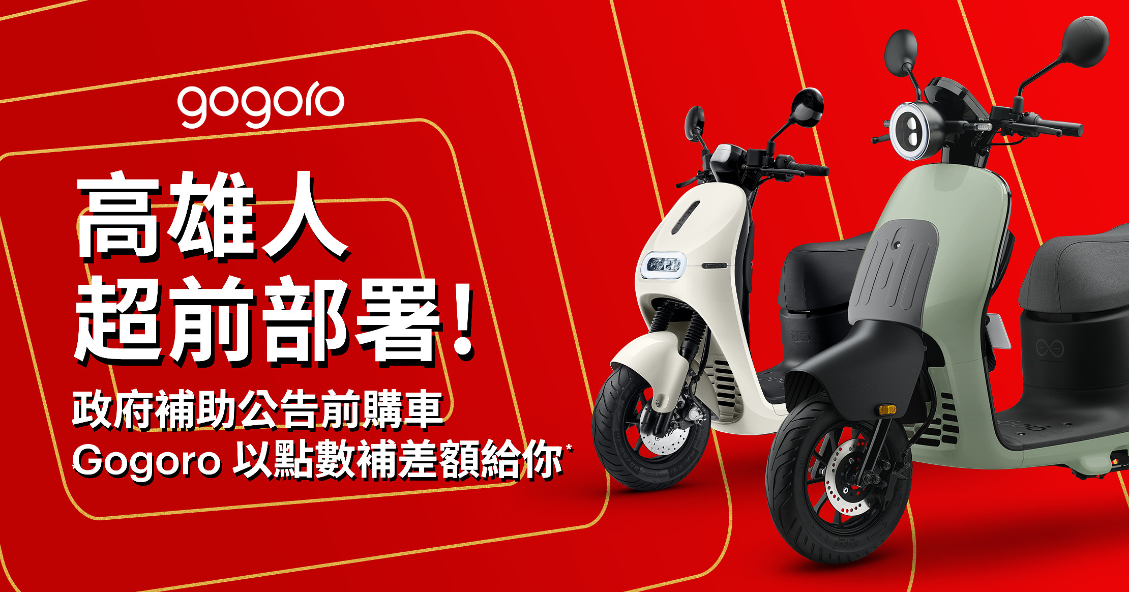*Gogoro 補差額給你:係指西元(下同) 2026 年 1 月 1 日起至 2026 年高雄市縣政府環境保護局電動機車補助規定公告日(含當日)前 (下稱「活動期間」),至 Gogoro® 直營、加盟門市、社區店、特約推廣站、或家樂福、大全聯、momo 等指定通路,購買 Smartscooter® 任一車款並完成購車手續及付清全額者(需於活動期間建立訂單並開立發票及繳交完整領牌資料,依 Gogoro 門市系統記錄為主),並於 2026 年高雄市縣政府環境保護局電動機車補助規定公告後透過 Gogoro 申請 2026 年高雄市縣政府環境保護局電動機車補助並繳交完整補助申請資料及通過政府審核時,將由 Gogoro 以 Gogoro Smart Points 點數提供 2026 年低於 2025 年高雄市縣政府環境保護局電動機車補助規定之差額(指 2026 年對比 2025 年之補助差額,下稱「贈品」)予參加人。高雄市專案適用名額限額100名,數量有限,送完為止。詳細相關資格與點數發放認定請見下方注意事項。。Gogoro Smart Points 1點 = 1元,可折抵 Gogoro 多項商品與服務及電池資費。點數使用規則請詳見 Gogoro Rewards 使用條款:https://www.gogoro.com/tw/gogoro-rewards-terms-of-use/