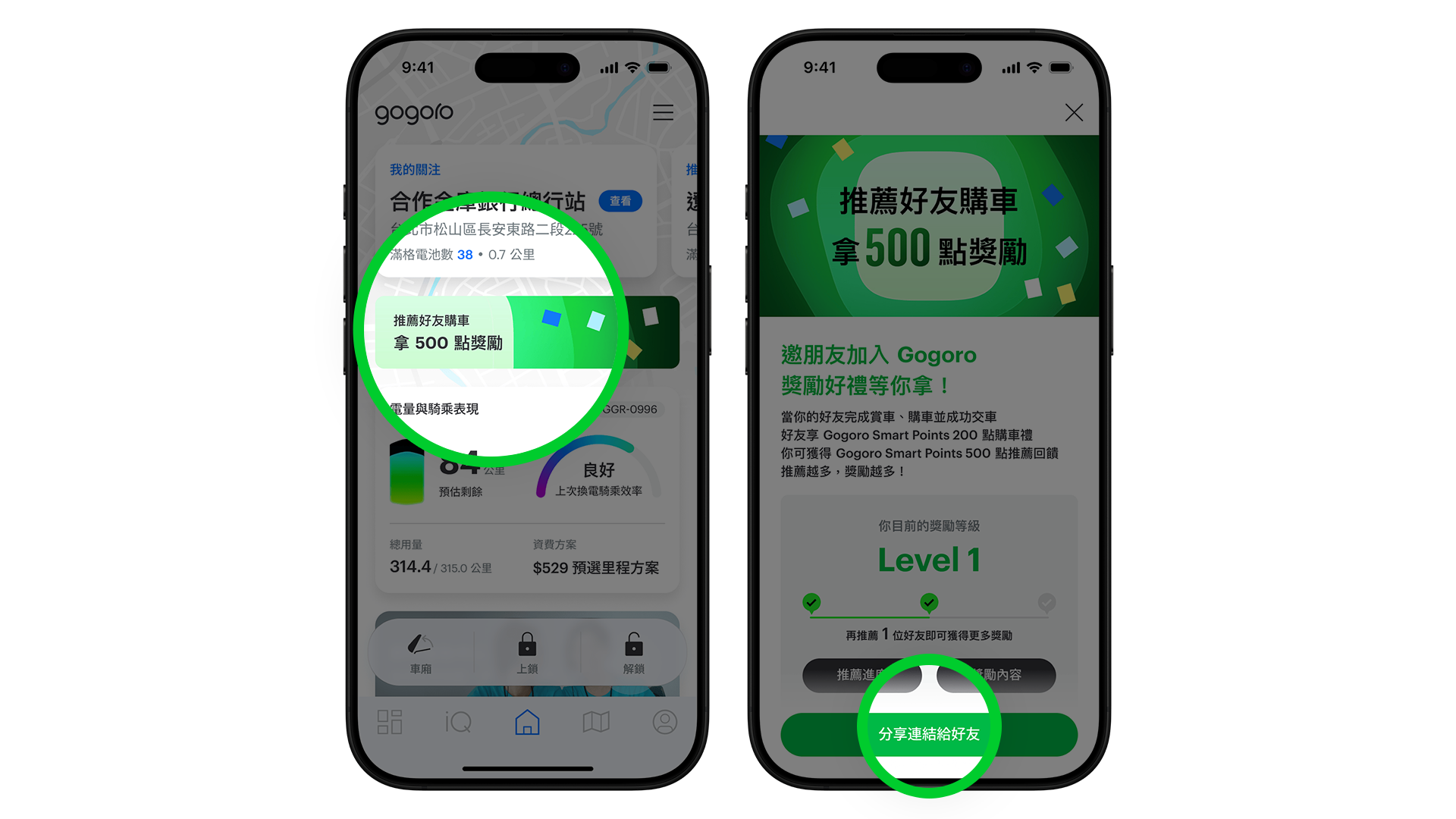 1. 從 Gogoro App 中的入口分享推薦連結給親友
