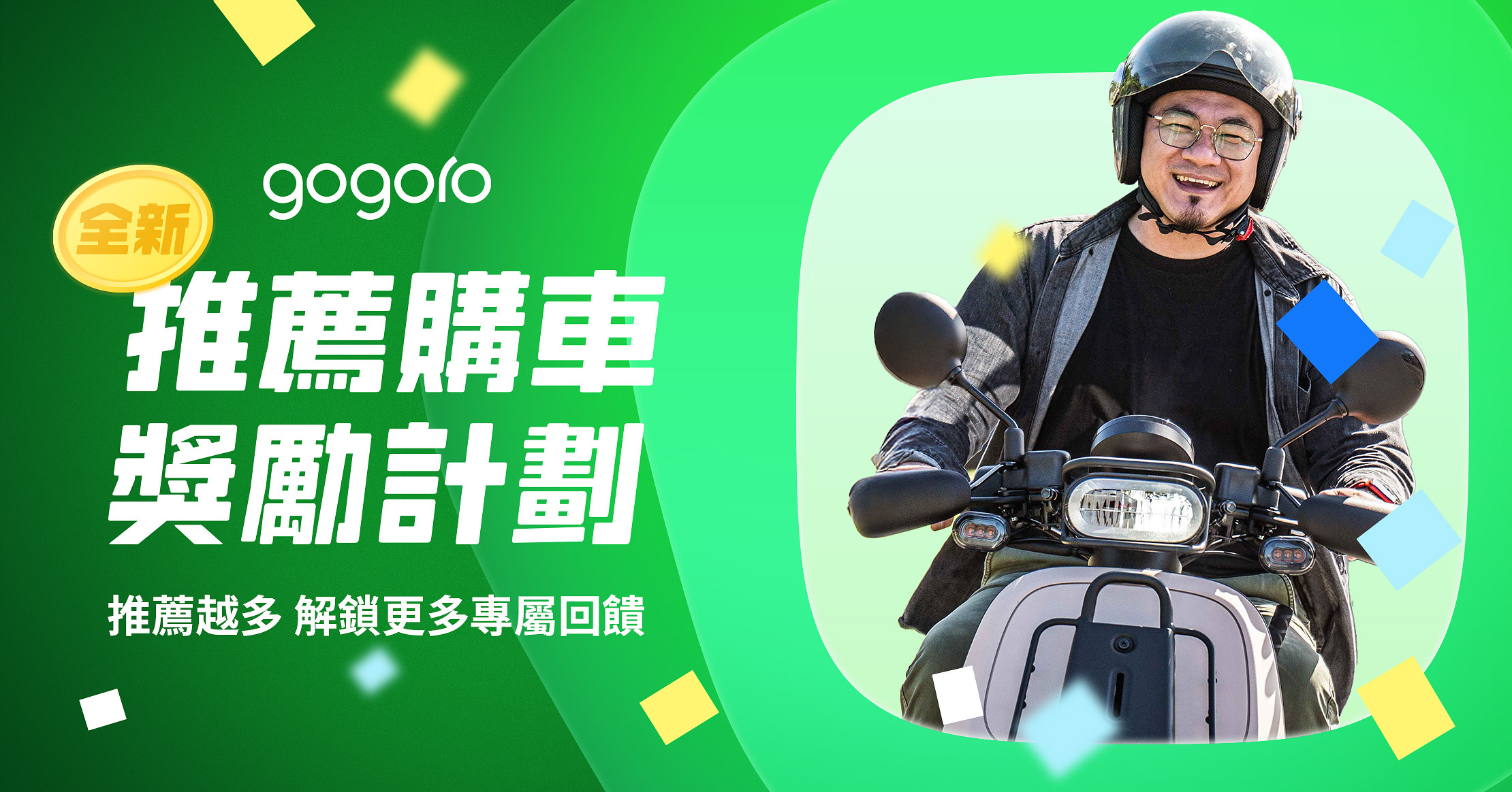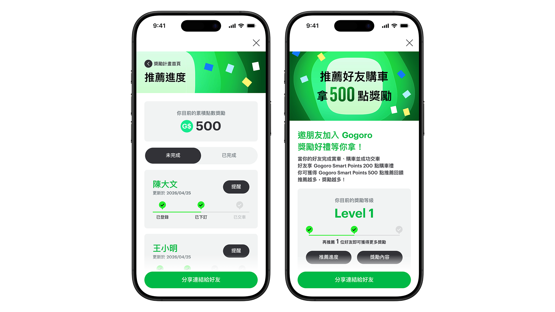 - 2026 年 4 月 13 日 中午 12:00 起至 2026 年 12 月 31 日止(下稱「活動期間」),Smartscooter® 智慧電動機車(下稱「智慧電動機車」)車主(下稱「推薦人」,惟不包含法人/非法人團體車主、Gogoro 直營/加盟門市人員、Gogoro 特約推廣站人員、尚未交車之車主),以車主推薦連結推薦親友(下稱「被推薦人」,惟不包含法人/非法人團體車主、 Gogoro 車主)購買 Smartscooter® 智慧電動機車,且被推薦人經由車主推薦連結完成推薦登錄、確認推薦人相關資料,並完成購買 Smartscooter® 智慧電動機車全車系乙台付清全額(需於活動期間建立訂單並開立發票,依 Gogoro 門市系統記錄為主)並於 2027/1/31 前完成領牌交車,經 Gogoro 確認資料無誤者,即屬「成功推薦購車」,推薦人和被推薦人將獲得如下獎勵。