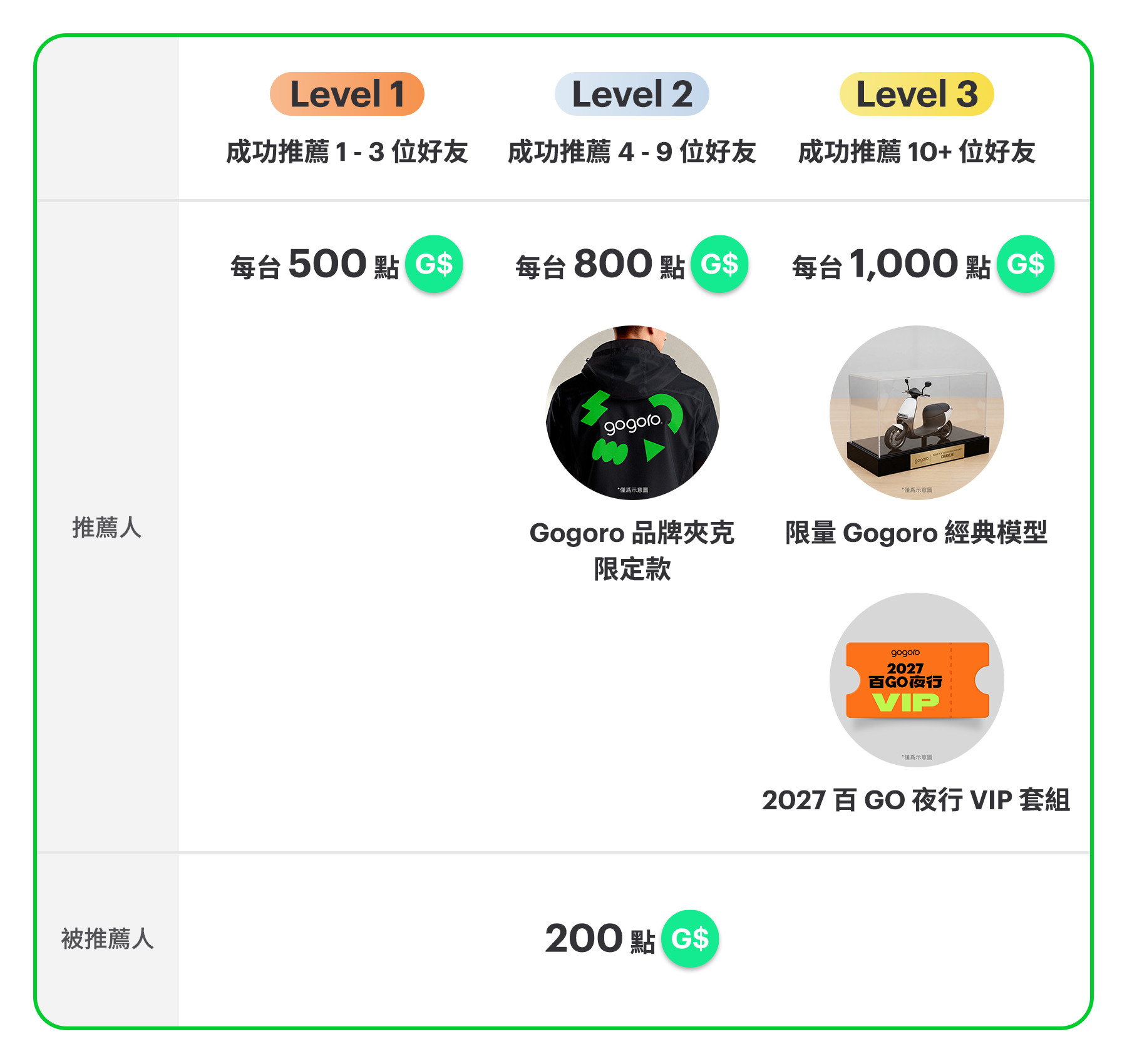 - 點數獎勵:推薦人成功推薦 1-3 台,將獲得每一台 500 點 Gogoro Smart Points 點數、推薦人成功推薦 4-9 台,將獲得每一台 800 點 Gogoro Smart Points 點數、 推薦人成功推薦 10 台以上(含 10 台),將獲得每一台 1000 點 Gogoro Smart Points 點數與推薦人成功推薦車數之相乘總和,舉例:推薦人於活動期間推薦 12 台,最終可獲得 500 點*3 台+800 點*6 台+1000 點*3 台 = 9,300 點,以此類推。