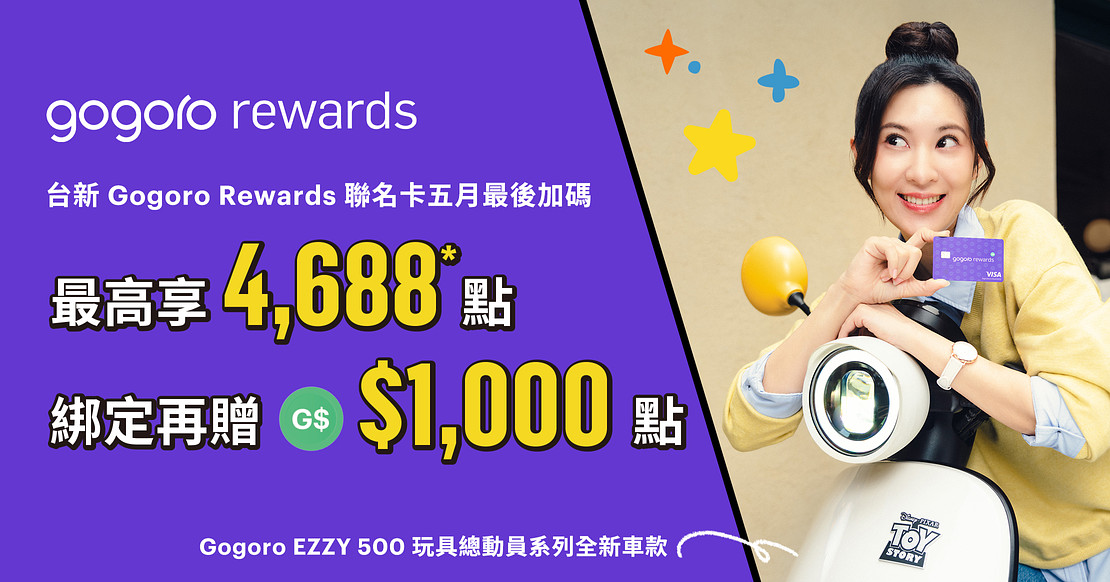 2026/5/24 前,使用台新 Gogoro Rewards 聯名卡付款,並綁定於 Gogoro Wallet 購買 Gogoro 全系列車款,一次付清最高享 4,688 點 Gogoro Smart Points 回饋。Gogoro Wallet 綁定禮 1,000 點 Gogoro Smart Points!Gogoro EZZY 500 生活超好過