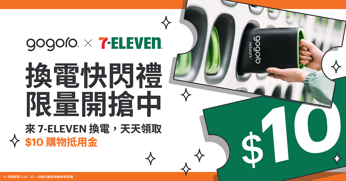 去 7-ELEVEN 換電站完成換電,天天領取限量 7-ELEVEN $10 購物抵用金!