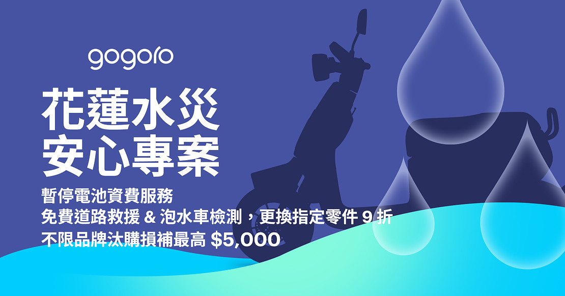Gogoro 花蓮水災安心專案:暫停電池資費服務、免費道路救援 & 泡水車輛檢測、更換指定零件 9 折,受損或失蹤車輛(不限品牌)汰購額外補助最高 $5,000